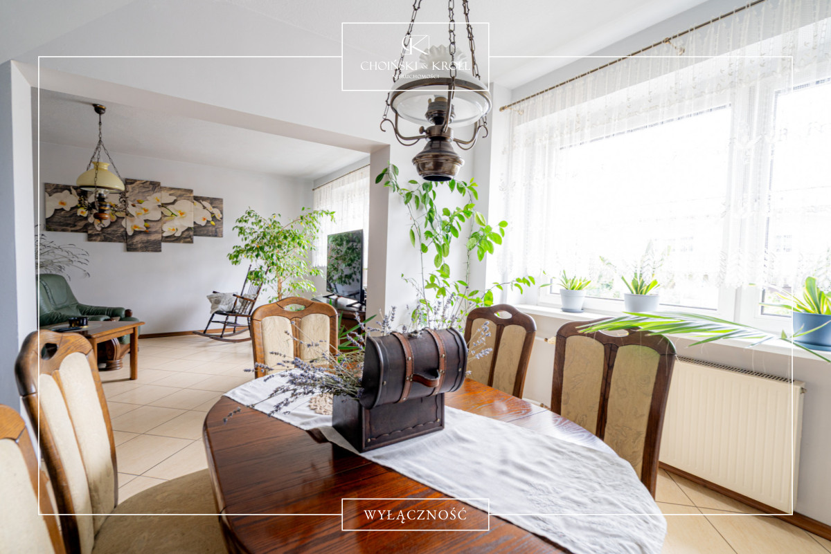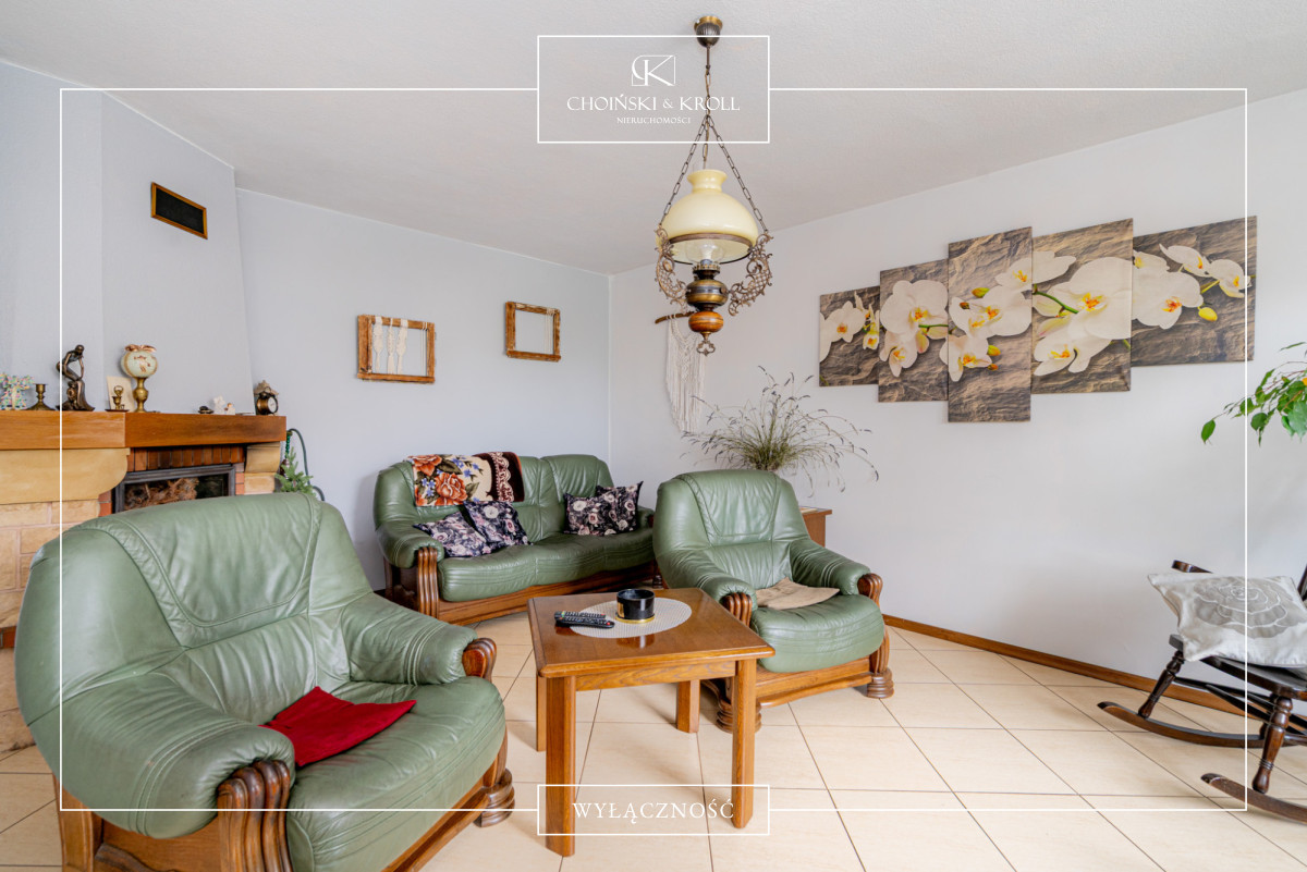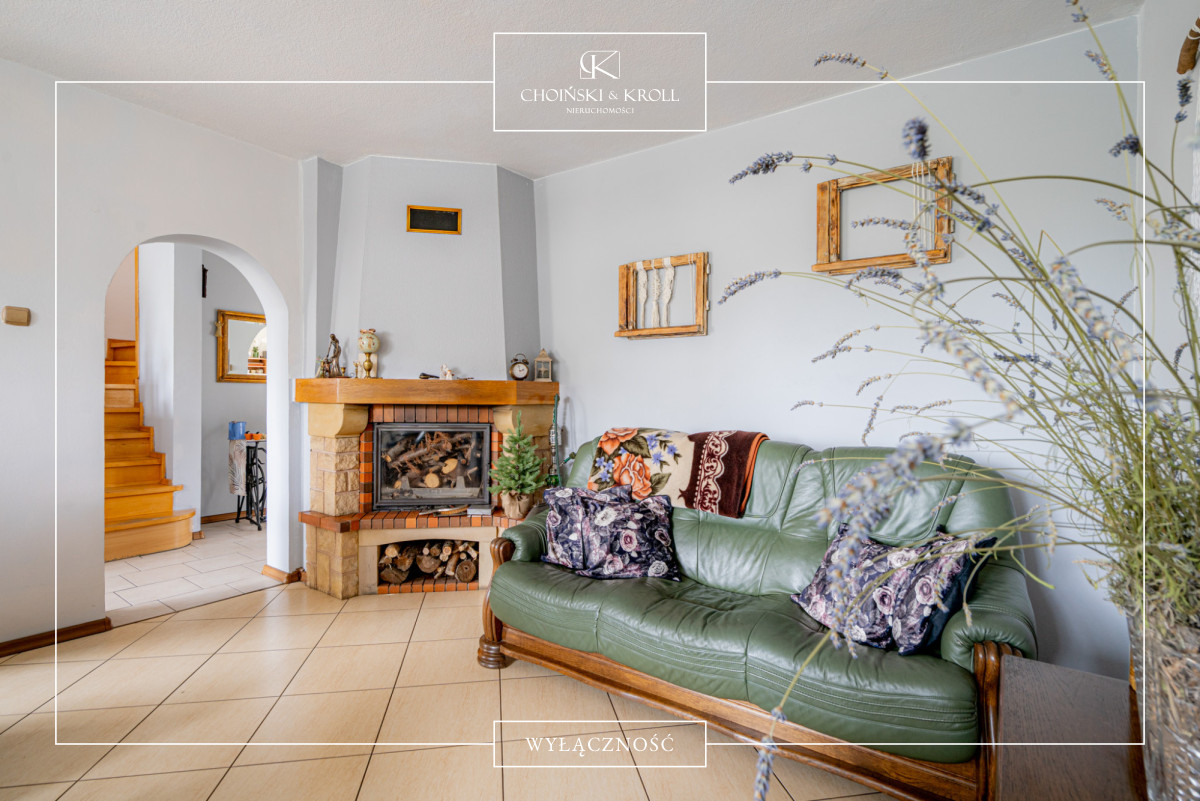 Dom składa się z czterech przestronnych pokoi, oddzielnej kuchni oraz jadalni, która stanowi idealne miejsce do rodzinnych posiłków. Do dyspozycji są także toaleta i łazienka, a cały budynek jest w pełni podpiwniczony, co daje dodatkową przestrzeń do przechowywania lub aranżacji według potrzeb. W salonie znajduje się przytulny kominek, tworzący ciepłą i wyjątkową atmosferę.