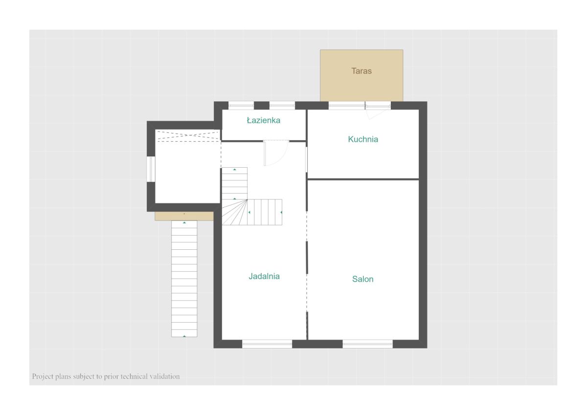 Parter: przedpokój, kuchnia, toaleta, duży pokój dzienny, jadalnia, taras;