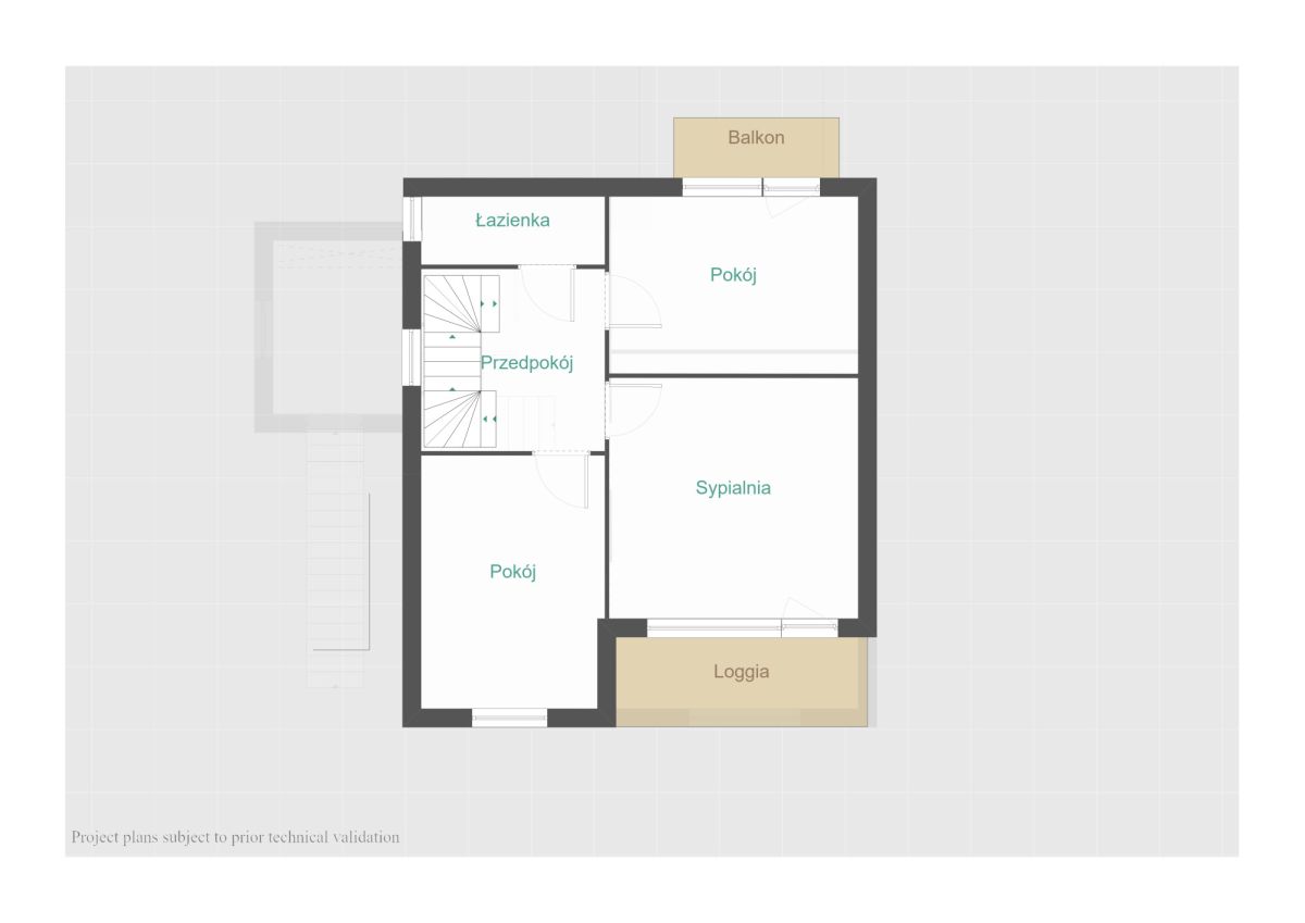 Piętro: łazienka, 3 pokoje, 2 balkony;