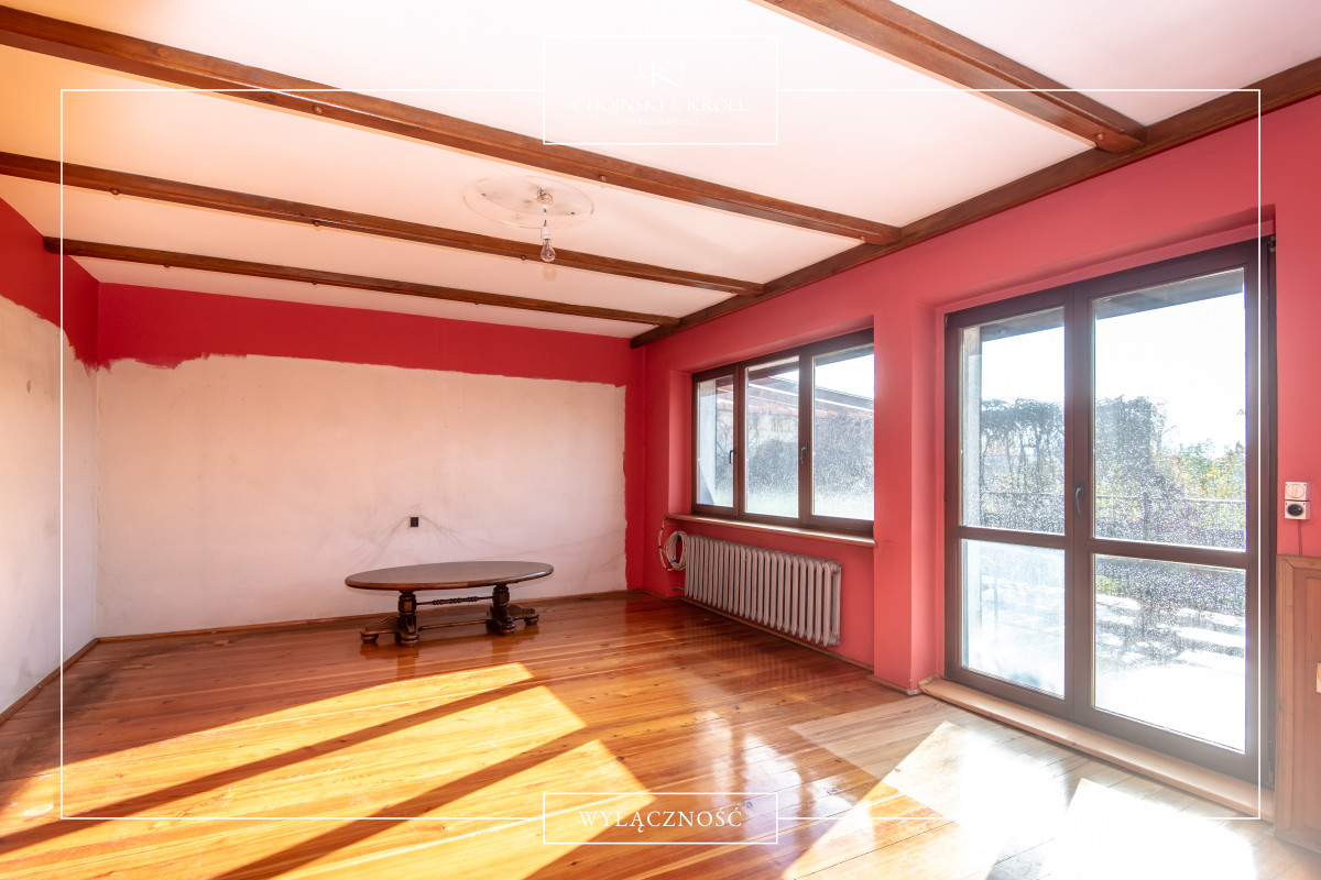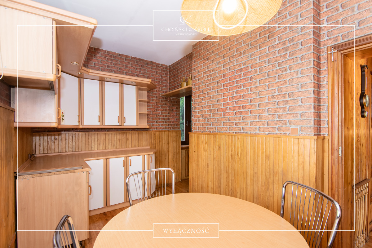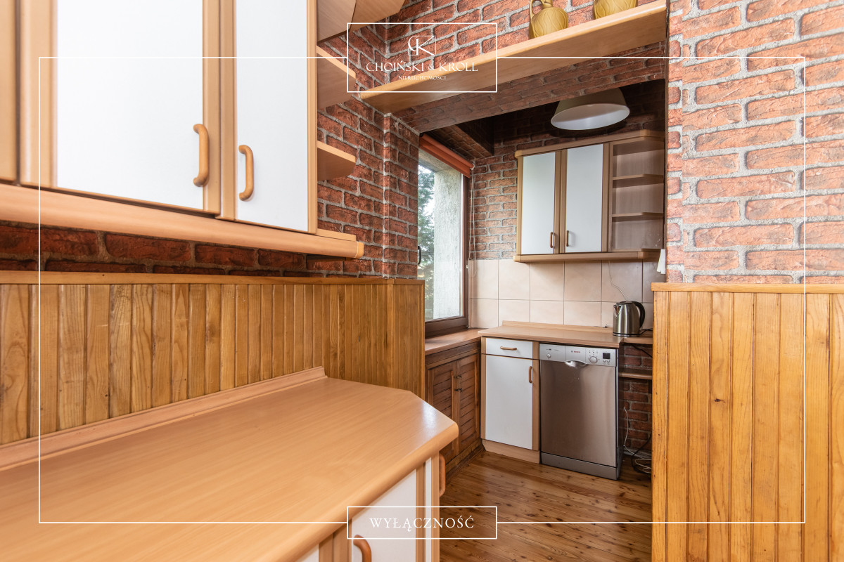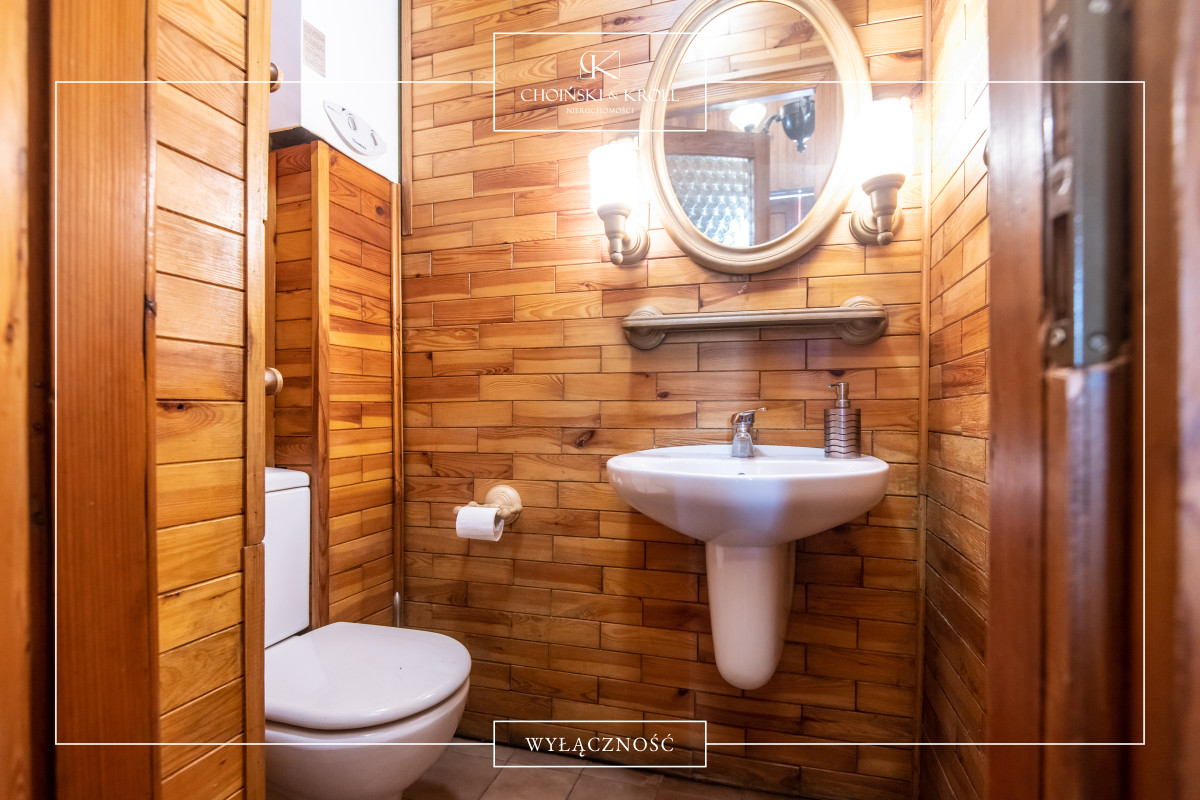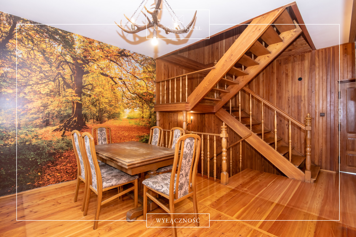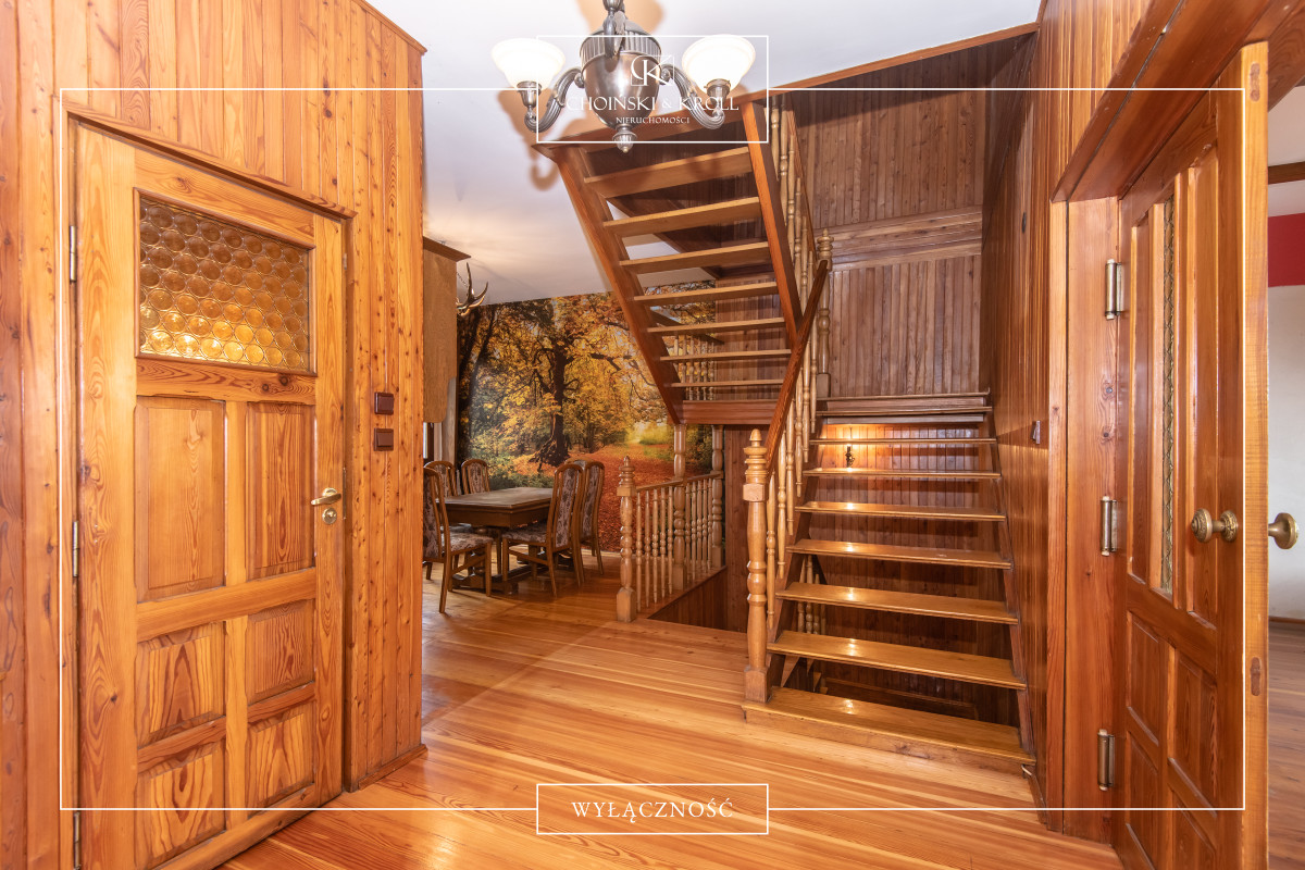 Dom posiada niepowtarzalny klimat, gdyż wykończony jest w większości drewnem modrzewiowym i dębowym. Dobrze zachowane parkiety, boazeria, drewniane schody oraz piękne drewniane drzwi zdecydowanie wyróżniają nieruchomość i nadają jej klasyczny, elegancki charakter.