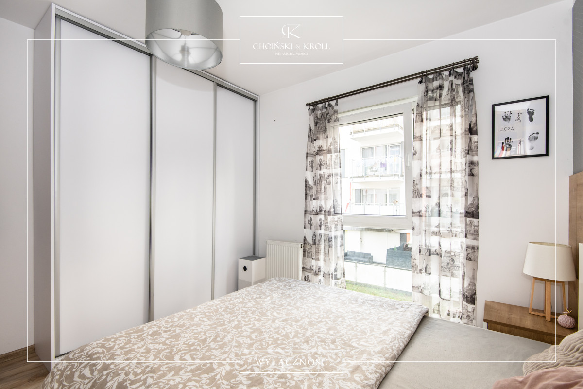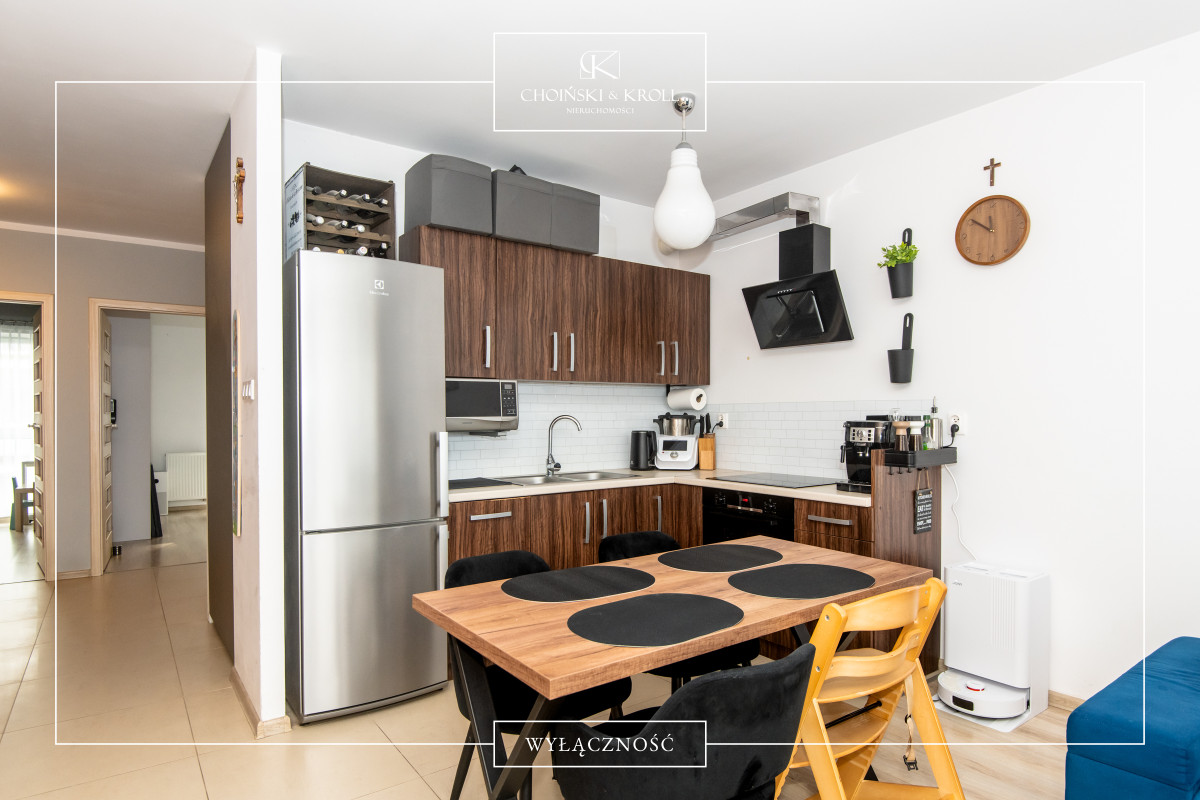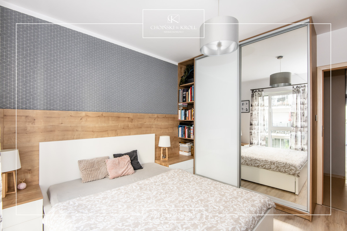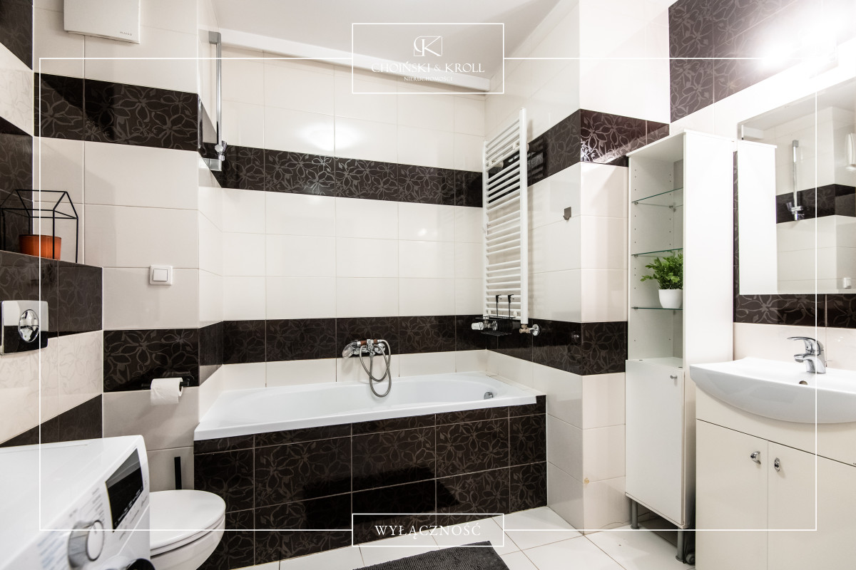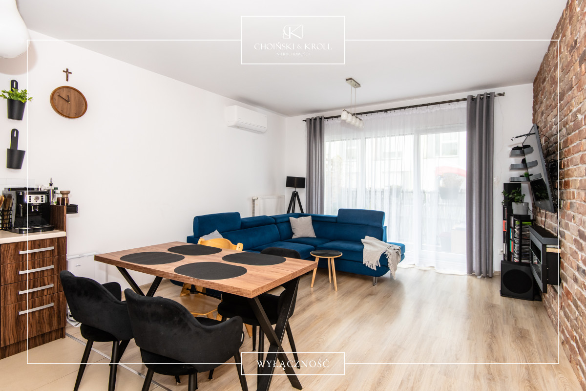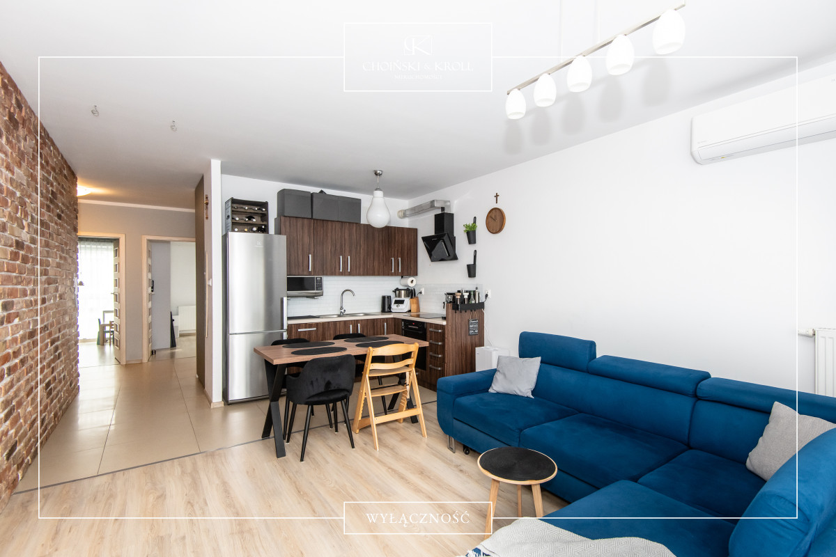 Mieszkanie charakteryzuje się przemyślanym i funkcjonalnym układem. Wyposażone jest w klimatyzację oraz rolety zewnętrzne, co zapewnia komfort użytkowania w gorące letnie dni. Z kolei biokominek w salonie tworzy przyjemny klimat w chłodne jesienne i zimowe wieczory. Jedna ze ścian w salonie pokryta jest efektowną cięta cegłą licową.