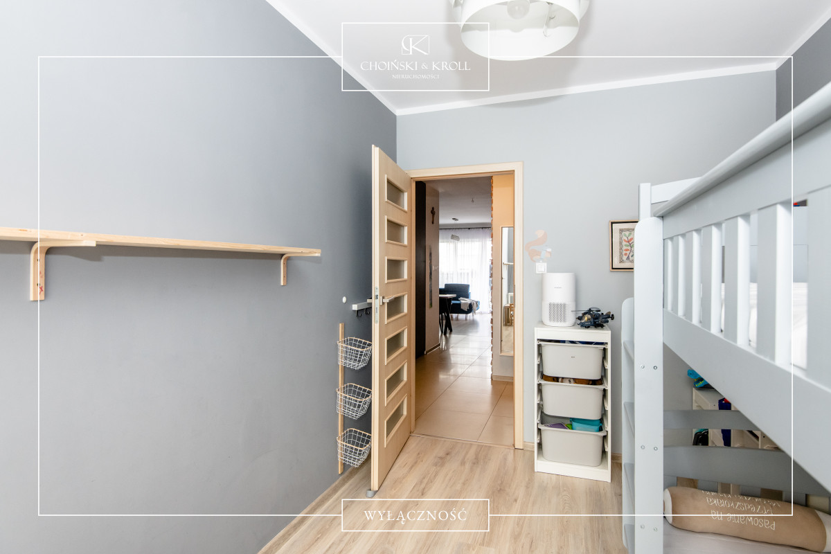 • ściany - gładź gipsowa (salon, sypialnie i korytarz), płytki (aneks kuchenny i łazienka), cięta cegła licowa (1 ściana w salonie)