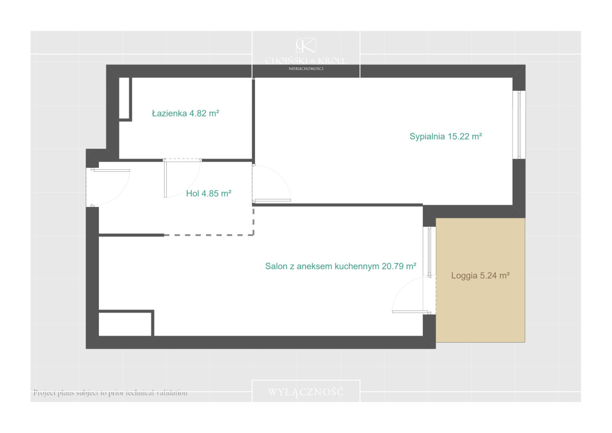 Układ mieszkania: salon z aneksem kuchennym z wyjściem na balkon, sypialnia, łazienka z toaletą.