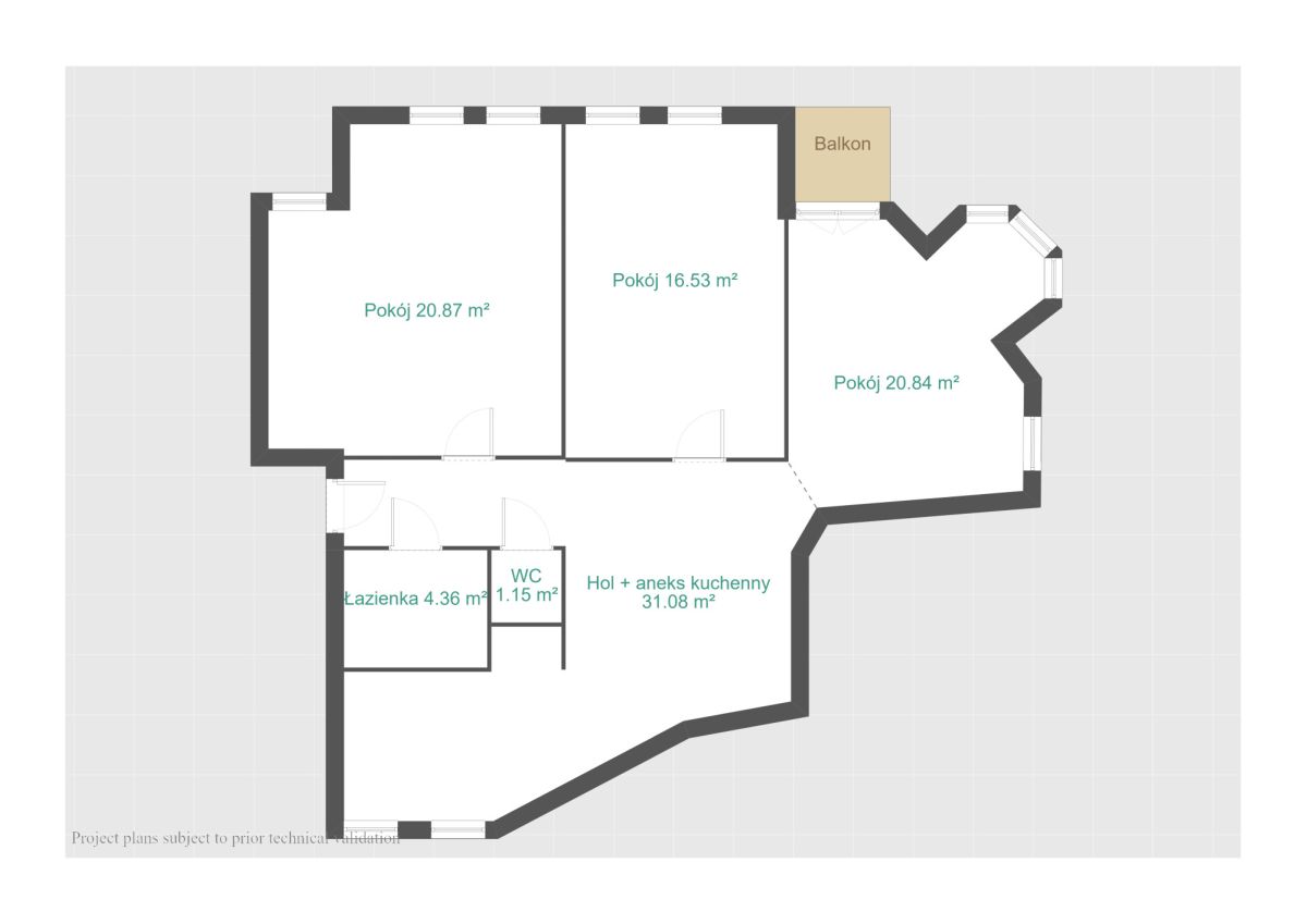 Mieszkanie składa się z trzech pokoi, jadalni z aneksem kuchennym (powstałej z dalszej części korytarza), łazienki, osobnego WC oraz balkonu. Do lokalu przynależy również piwnica. Wysokie sufity (ok. 3,2 m) i duże okna zapewniają przestrzeń, światło i wyjątkowy klimat wnętrza.