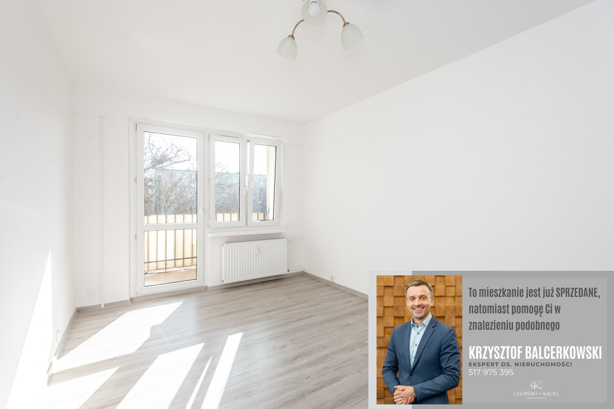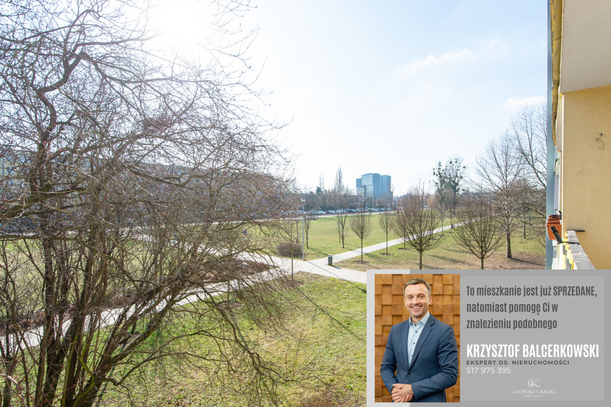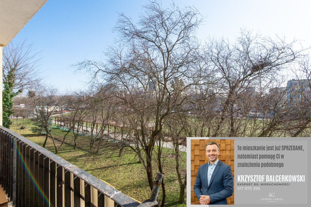 Trzy pokoje od strony południowej, balkon z widokiem na park, jeden pokój i kuchnia od strony północnej.