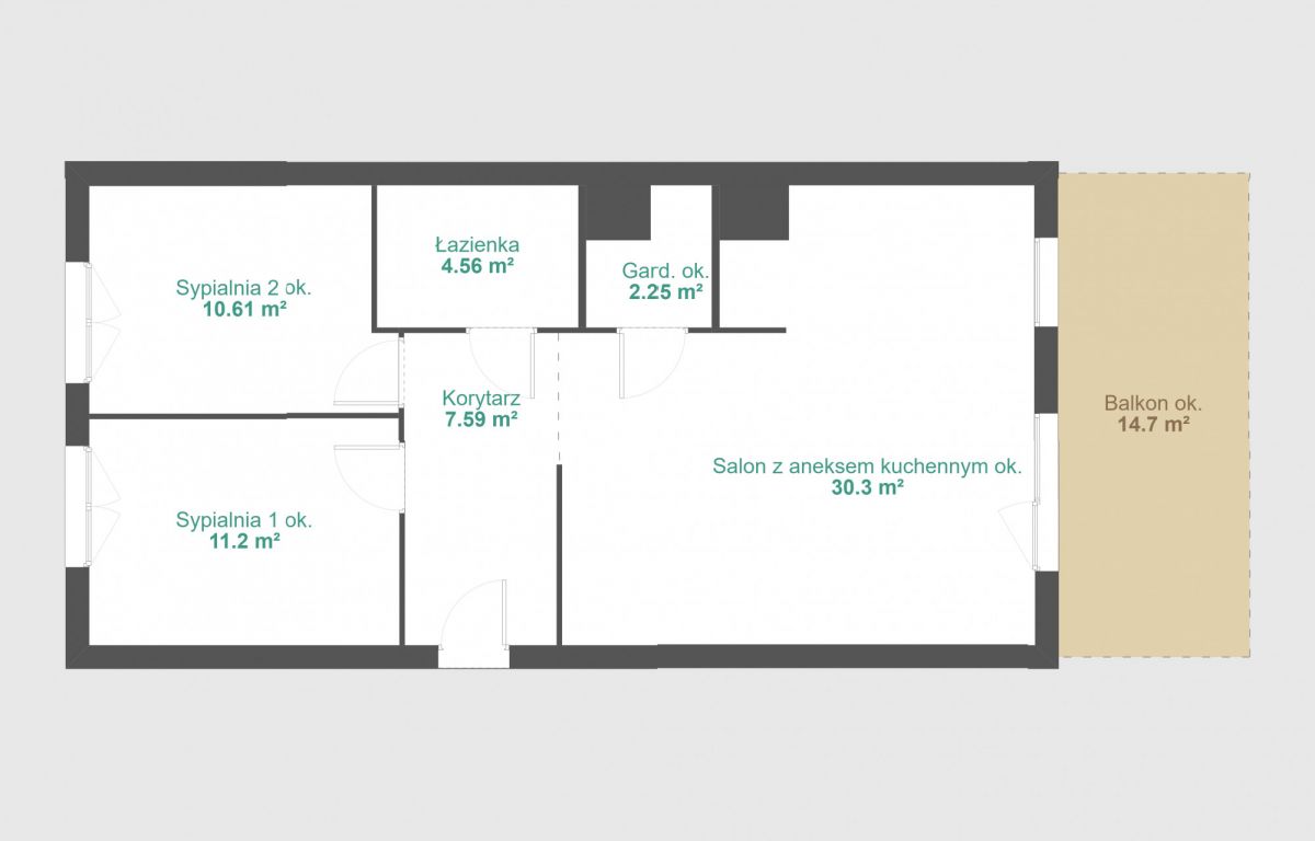 Układ mieszkania: salon z aneksem kuchennym, dwie niezależne sypialnie i łazienka