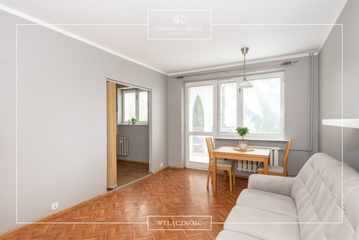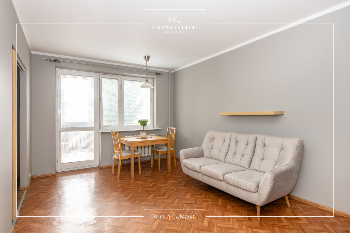 → Salon z wyjściem na spory balkon - jasny i przestronny, z dużą ilością naturalnego światła (ekspozycja południowa), wygodną kanapą i stołem z 2 krzesłami