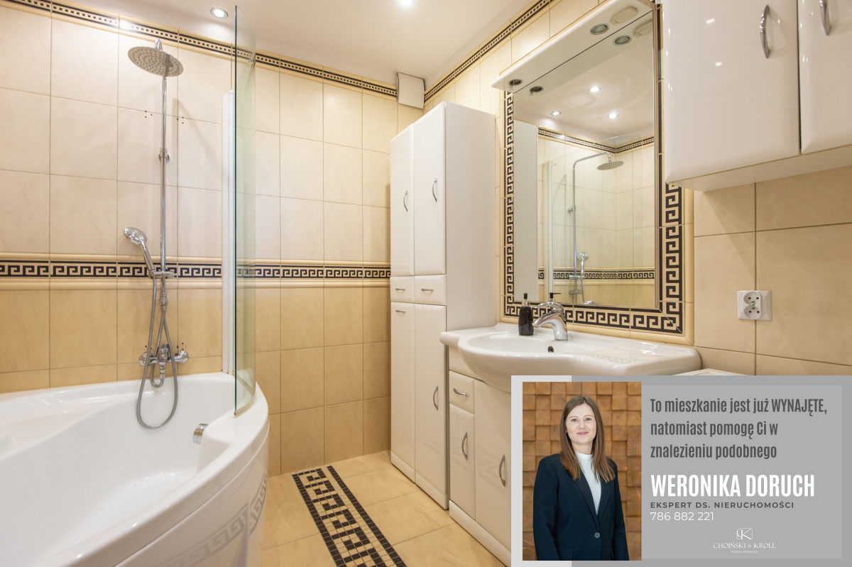 • łazienka - wanna z przesłoną prysznicową, pralka, umywalka oraz liczne szafki