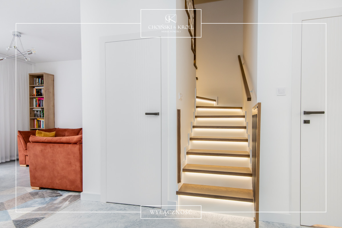 * schodów z podświetleniem ledowym, wykończonych drewnem dębowym prowadzących na piętro