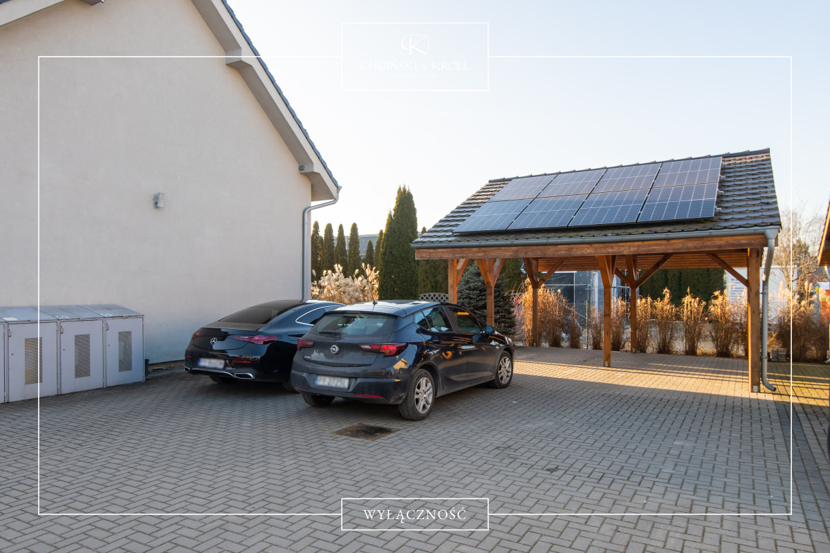 Na terenie posesji znajduje się wiata samochodowa z instalacją fotowoltaiczną, mieszcząca dwa auta, a dodatkowo przestronny podjazd, który umożliwia zaparkowanie kolejnych 3-4 samochodów.