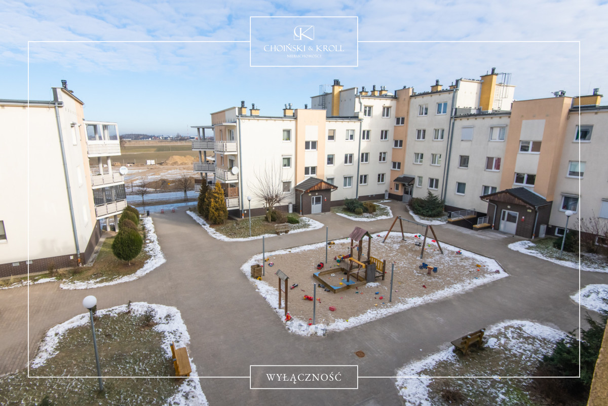 • ciekawy układ budynku w kształcie litery „C” z wewnętrznym dziedzińcem z placem zabaw
