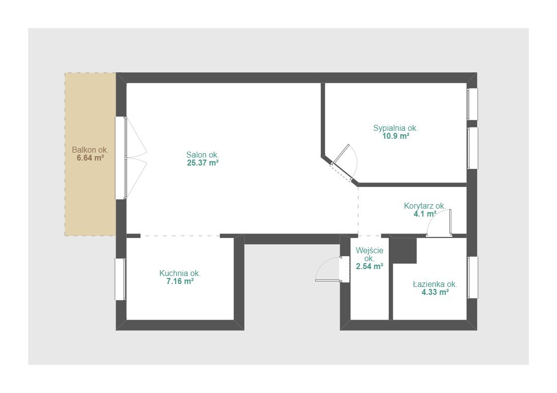 - kuchni - ok. 7,16 m² (częściowo wydzielona)