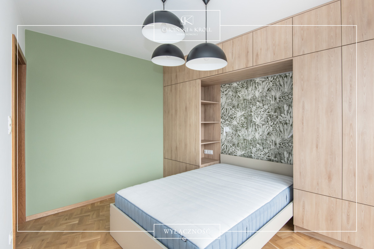 Układ mieszkania: salon z aneksem kuchennym, sypialnia, łazienka z toaletą, garderoba.
