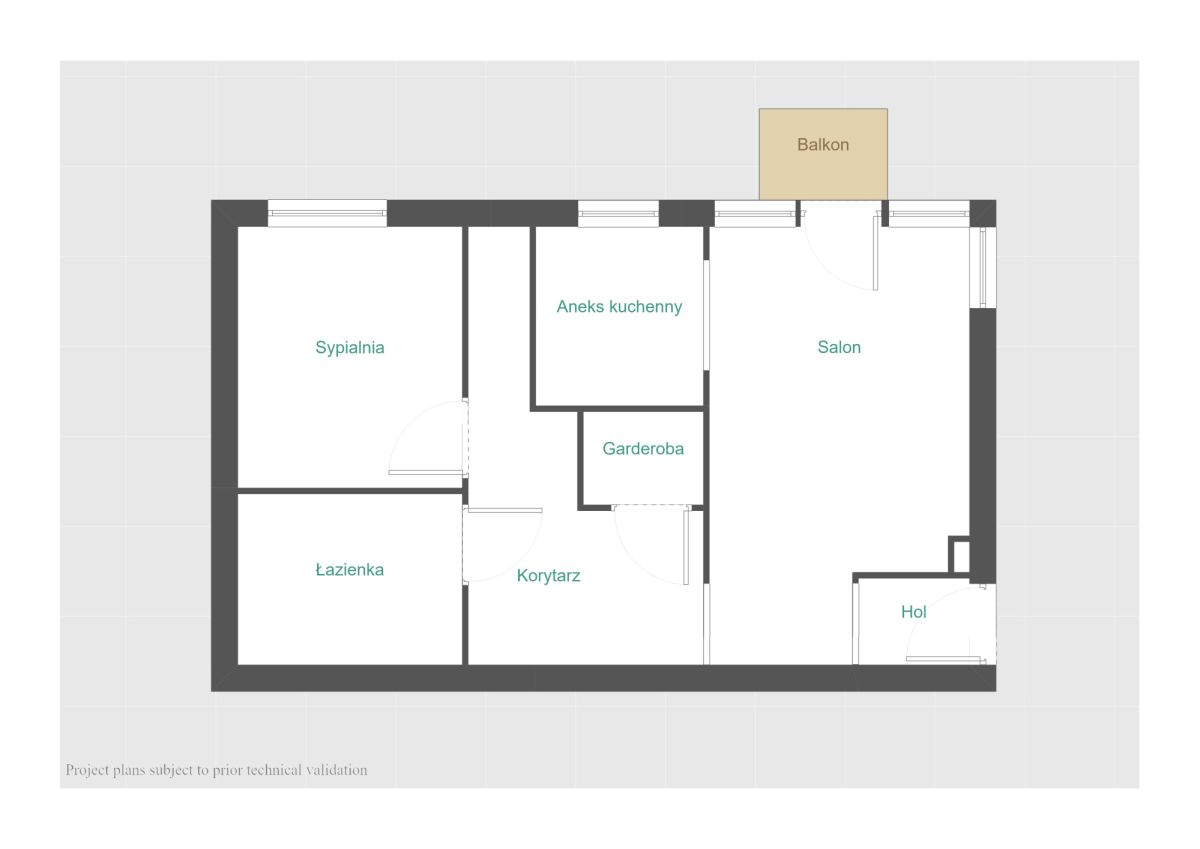 Mieszkanie o powierzchni całkowitej około 48 m2 składa się z: